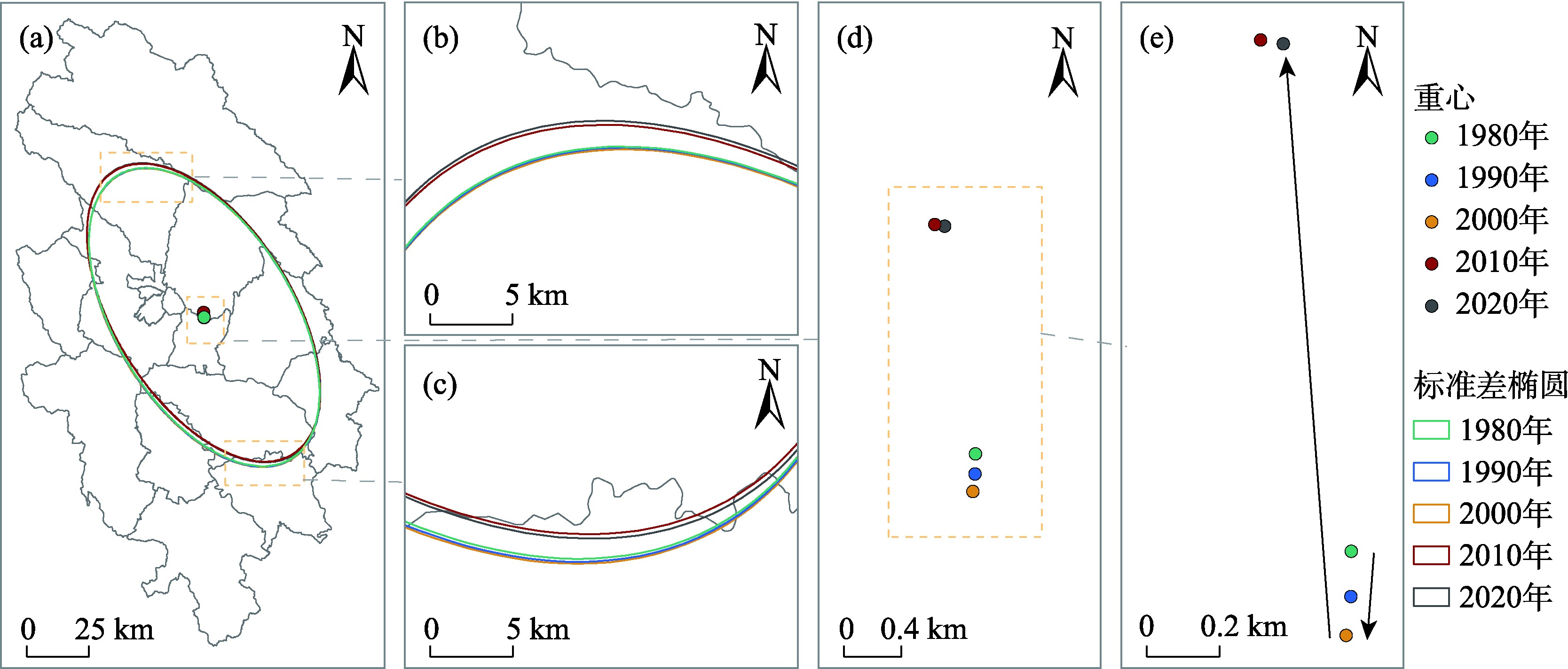 | 年份 | 标准差椭圆 | 重心 | |||||