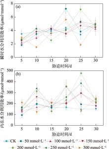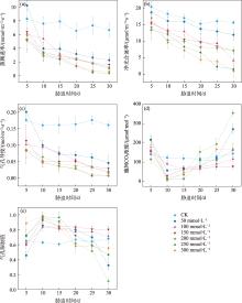 为揭示四翅滨藜(Atriplex canescens)幼苗对盐碱胁迫的适应能力,采用盆栽控制试验方法,研究四翅滨藜幼苗生物量、根系生长、光合生理特性、水分利用效率对不同浓度盐碱胁迫的响应。结果表明:(1) 0~100 mmol·L-1盐碱溶液胁迫下,对四翅滨藜幼苗细根长度、细根表面积、比根长、比根面积、根组织密度、总根系长度、总根体积、总根表面积和总根平均直径均有显著促进作用。(2) 溶液浓度大于150 mmol·L-1后,随着盐碱胁迫浓度增加与胁迫时间延长,各项生物量和根系参数均显著减小。(3) 随着盐碱胁迫时间延长,净光合速率、蒸腾速率和气孔导度持续下降,下降程度与溶液浓度呈正相关。(4) 瞬时水分利用效率和内在水分利用效率随着胁迫时长逐渐增大。研究揭示了四翅滨藜幼苗在应对不同浓度盐碱胁迫与不同胁迫时长下的生长关系,为盐碱地治理提供四翅滨藜幼苗适应性生长的科学依据。