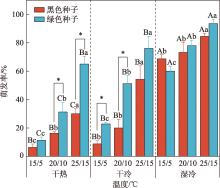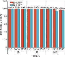 | 绿色种子 | 17±6.8Ca | 54±8.9Ba | 75±5.5Aa | 100±0.0Aa | 100±0.0Aa | 100±0.0Aa | |
