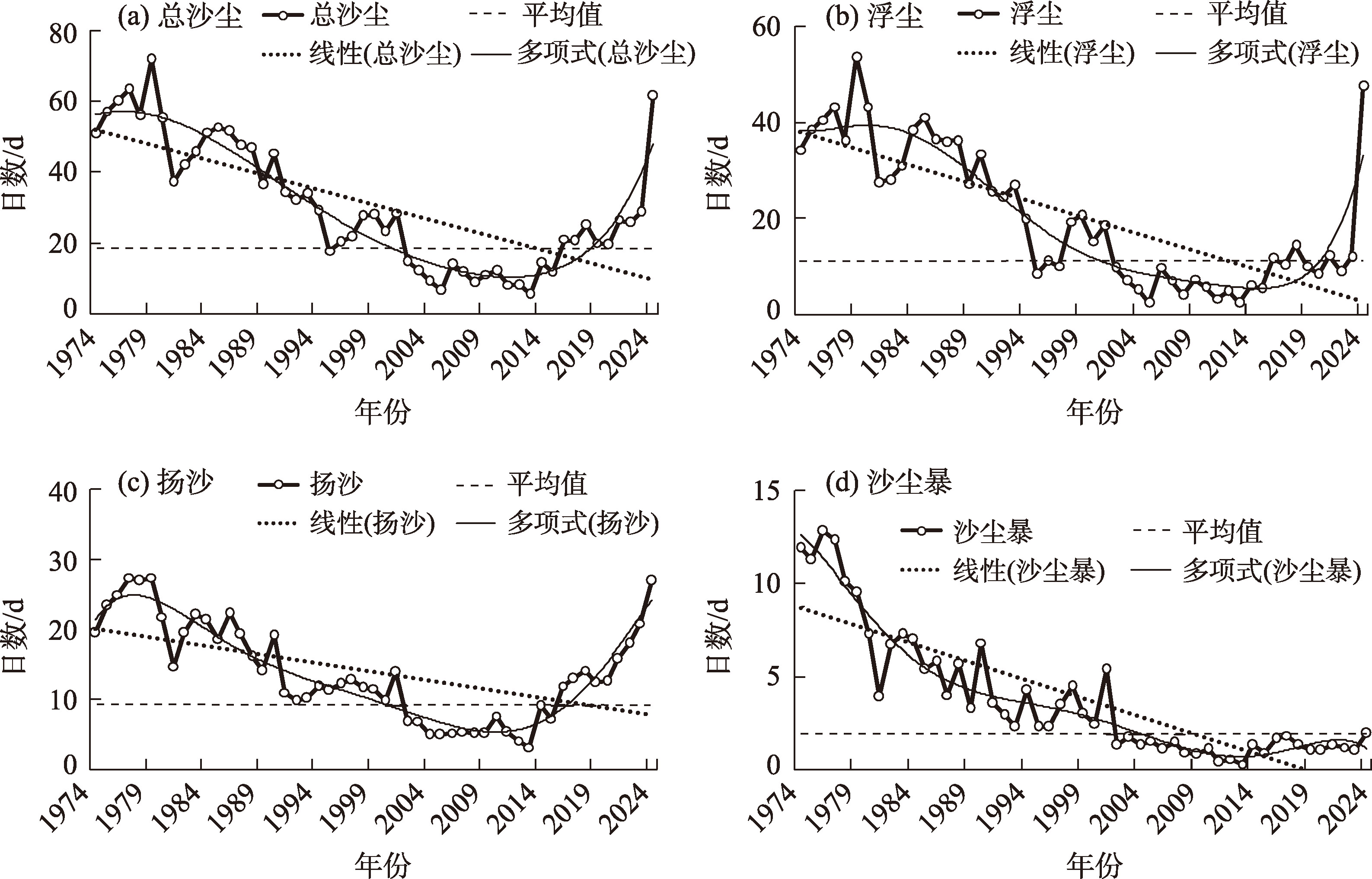 This study uses ground meteorological observation data from 11 national meteorological stations and 192 regional stations in the Tuha Area, spanning from 1974 to 2024, to analyze the spatiotemporal variations of sand-dust weather and its correlation with meteorological factors. The results reveal the following: (1) Floating dust is the most frequently occurring sand-dust weather event in the area, followed by blowing sand; sandstorms occur least frequently. The peak period for sand-dust weather is in spring. Blowing sand and sandstorms are more common in summer and the least in winter, whereas floating dust is more frequent in autumn than in summer. (2) The distribution of sand-dust weather days shows a pattern of higher occurrence in the west compared to the east, and more prevalence in basins than in mountainous areas. High-incidence areas for floating dust include Tuokexun and Gaochang District of Turpan City. Blowing sand and sandstorms are mainly concentrated around the Tuokexun-East Kan’er Station and Naomaohu Station, whereas mountainous regions such as Barkol and Yiwu in Hami City experience very few sand-dust weather events. In addition, significant differences exist in wind direction and speed associated with sand-dust weather across different regions. (3) Over the past 50 years, the total number of sand-dust weather days has shown an overall decreasing trend, with floating dust decreasing at the fastest rate of 7.1 days per decade. The 1970s recorded the highest sand-dust weather, whereas 2013 recorded the lowest. In the past decade, the total number of days with sand-dust, floating dust, and blowing sand has significantly increased. Abrupt changes in the annual counts of sand-dust, floating dust, and blowing sand occurred in 1991, 1995, and 1991, respectively, whereas the trend for sandstorm days did not exhibit a clear abrupt change. (4) The number of sand-dust days shows a significant positive correlation with both the number of strong wind days and average wind speed, a significant negative correlation with average temperature, and no clear correlation with precipitation or sunshine duration.