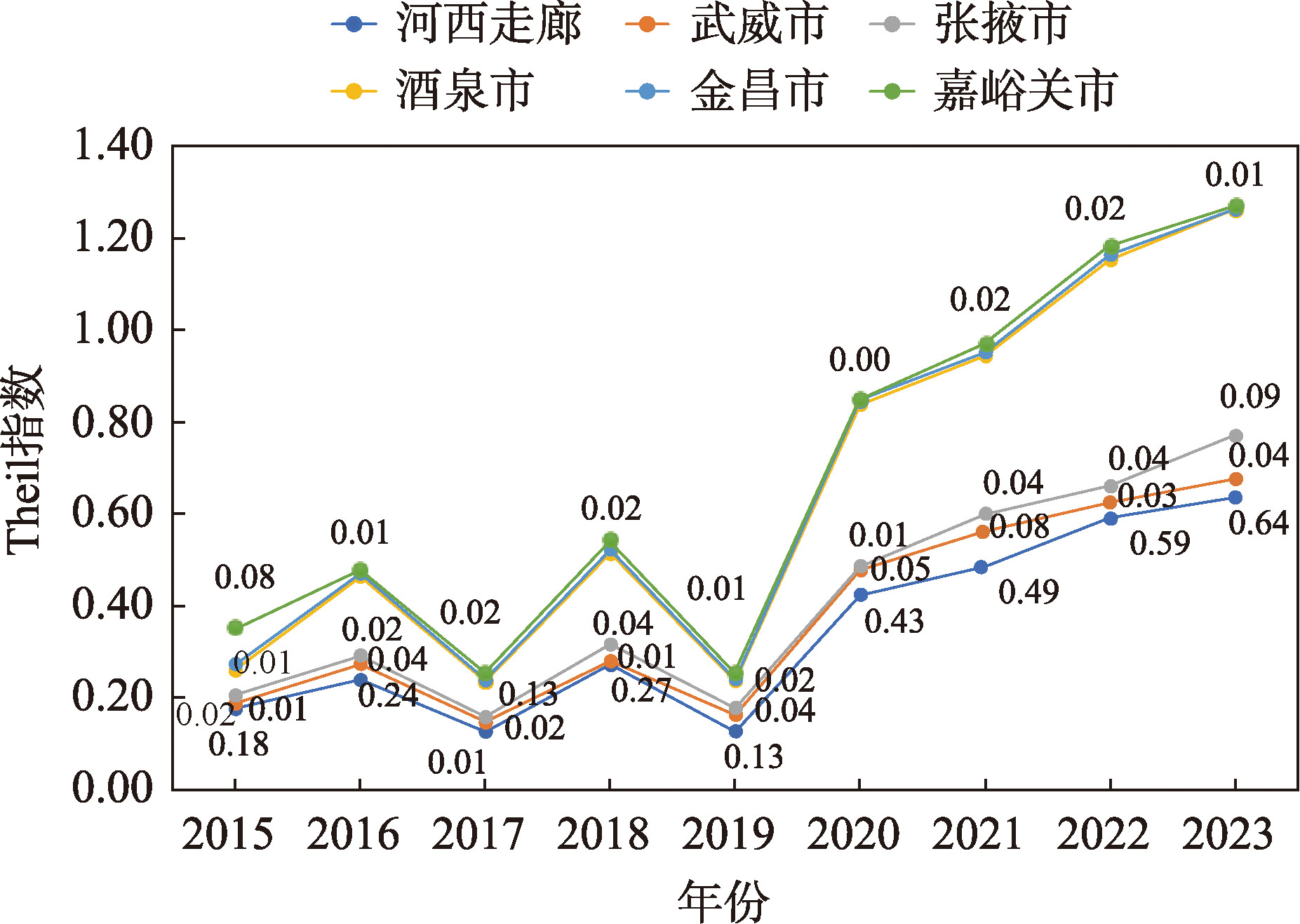 Given oasis degradation and increased human activities in the arid northwest region, quantifying the resilience of the oasis socioecological system in the Hexi Corridor and uncovering its spatio-temporal differentiation patterns have become critical issues in ecological security research for arid areas. This study developed a resilience assessment index system and conducted a comprehensive analysis of the evolution of resilience within the oasis system in the Hexi Corridor from 2015 to 2023, utilizing the entropy method alongside other relevant approaches. The findings indicate that (1) the resilience of the socioeconomic and resource management subsystems generally increased, rising from 0.36 to 0.46 and from 0.38 to 0.69, respectively. By contrast, the resilience of the ecological state subsystem initially increased, reaching 0.70 in 2021, but then declined to 0.60 in 2023, down from 0.40 in 2015; (2) overall system resilience remained stable but at a relatively low level, with an average score of 0.35; (3) the Theil index across the five cities in the region exhibited an upward trend, with the overall index rising from 0.18 to 0.64. However, it decreased from 0.24 to 0.13 between 2016 and 2017 and from 0.27 to 0.13 between 2018 and 2019; (4) the system’s kernel density curve demonstrated a tailing feature, evolving from a “single peak” to a “multipeak” pattern. Finally, the study proposed countermeasures and suggestions focusing on three areas: developing a spatially differentiated intelligent water resource management platform, implementing precise early warning systems, and enacting differentiated regulatory measures.